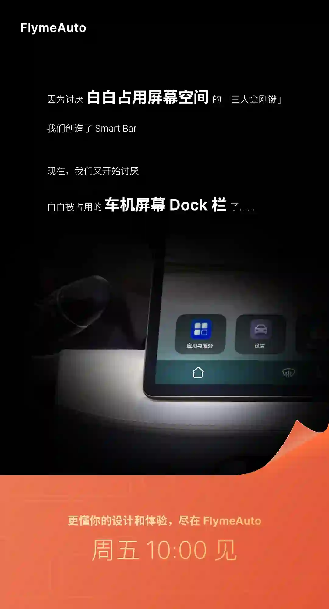 魅族在预热海报中称:“因为讨厌白白占用屏幕空间的「三大金刚键」,我们创造了 Smart Bar,现在,我们又开始讨厌白白被占用的车机屏幕 Dock 栏了。”言外之意,FlymeAuto 将重新设计车机屏幕,带来类似 Smart Bar 的交互体验。