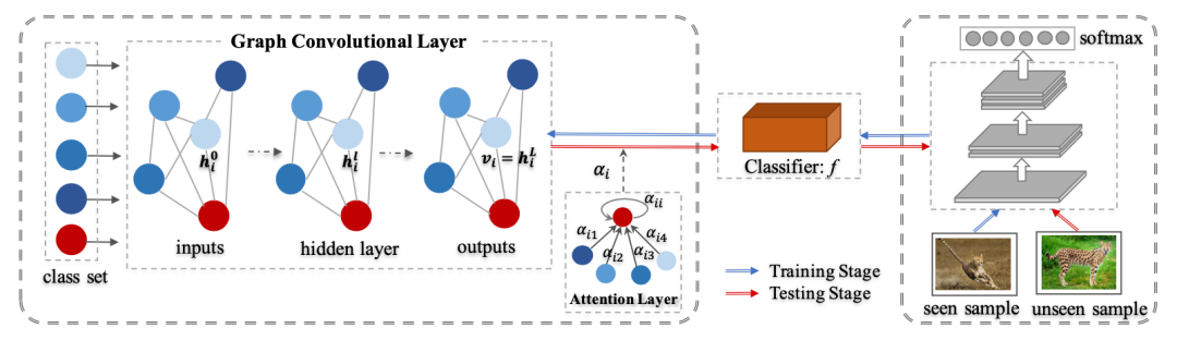 (2) 提出了一个新的、基于知识图谱和注意力图卷积神经网络的ZSL算法,它利用知识图谱建模类别间的语义关系,并且将样本特征由seen classes迁移到unseen classes,在标准数据集上提升ZSL模型效果的同时,为后面的可解释工作提供了基础;