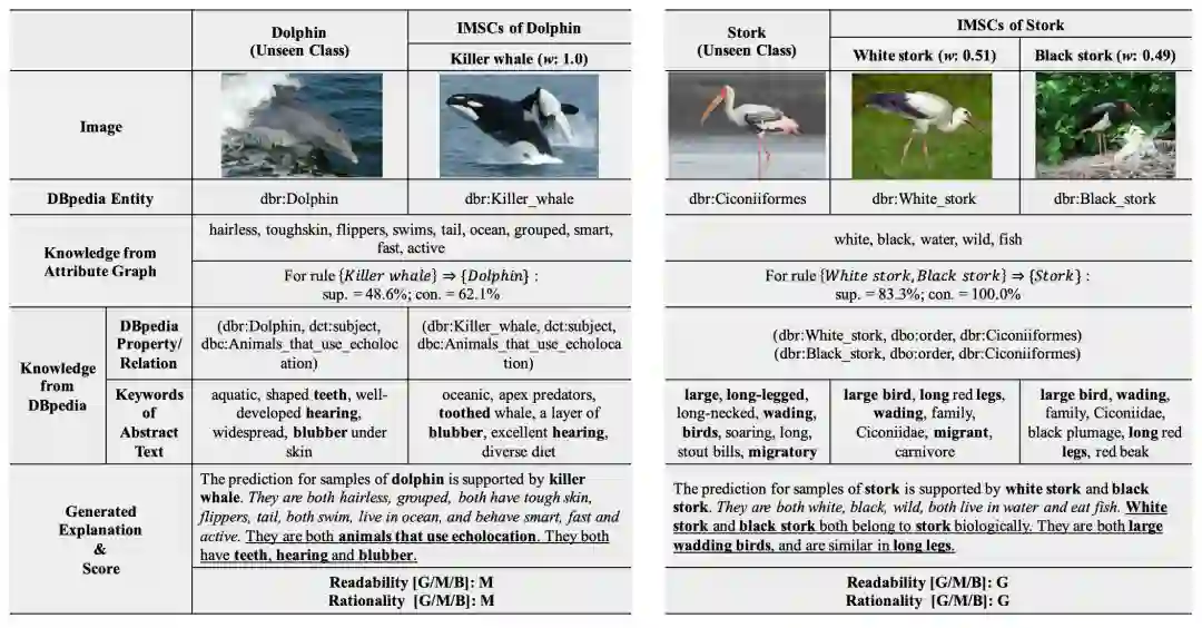 最终,本文在AwA和ImageNet两个数据集以及更稠密的ImageNet*数据集上验证了ZSL学习器的效果,同时邀请志愿者对生成的解释在可信度和可读性两方面进行了评估,并给出了一些案例。基于生成的解释,本文对ZSL模型中特征迁移的情况进行了更深入的讨论。评估结果分别如下: