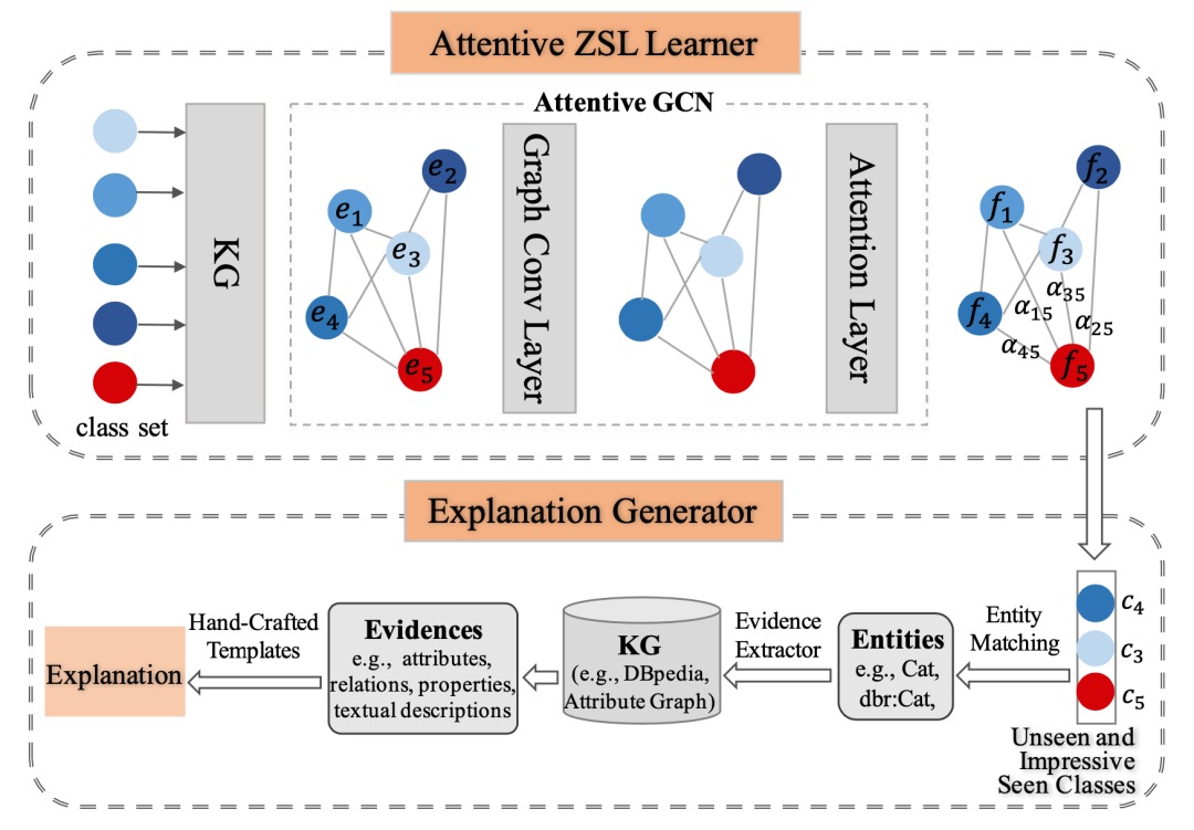 本文提出了一个基于知识图谱的ZSL可解释框架,在使用知识图谱帮助ZSL特征迁移的同时,利用知识图谱中丰富的类别知识,对特征的可迁移性作出解释。框架如图1所示,主要包括两部分:注意力ZSL学习器(Attentive ZSL Learner)和解释生成器(Explanation Generator)。其中: