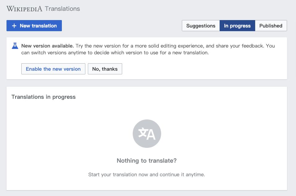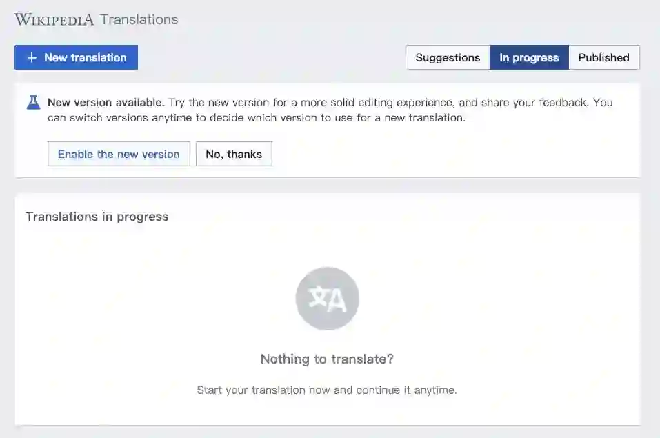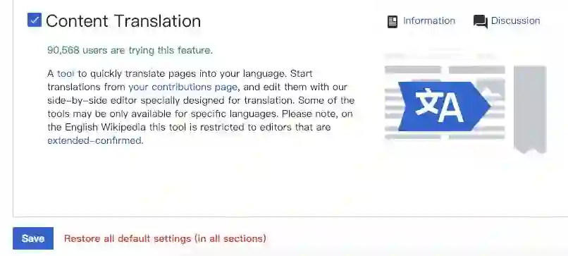 目前维基百科正尝试开放的新功能包括 TemplateWizard、New wikitext mode、Visual differences、Two column edit conflict以及 Content translation。这简直是维基百科编辑工作者的又一大福利!为此,我们专门探寻了 Content translation 这一功能的使用特性: