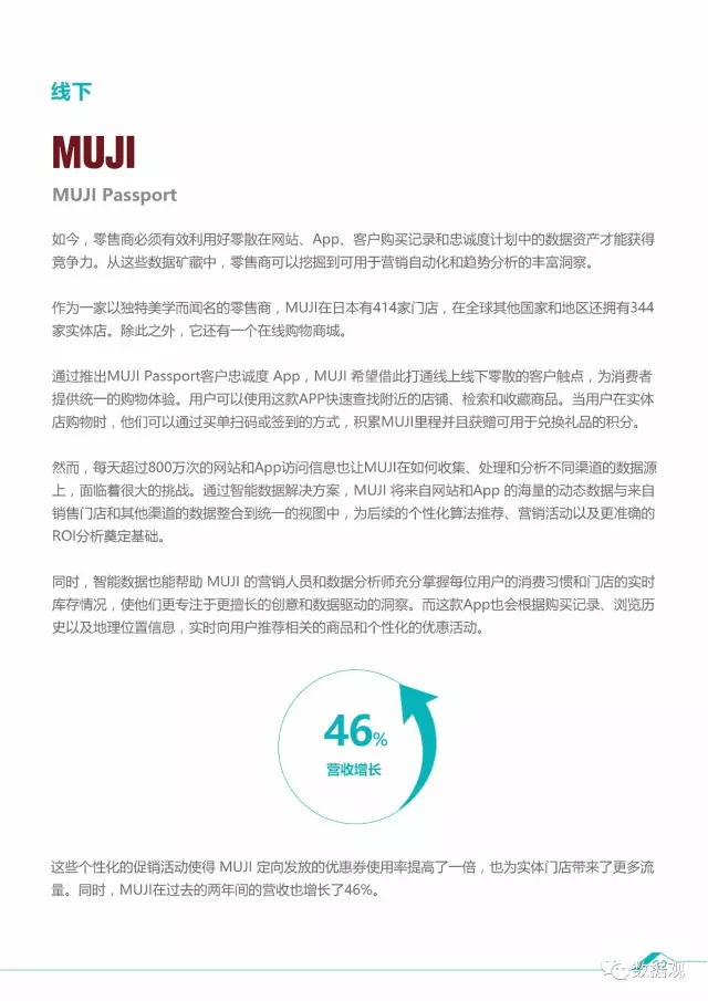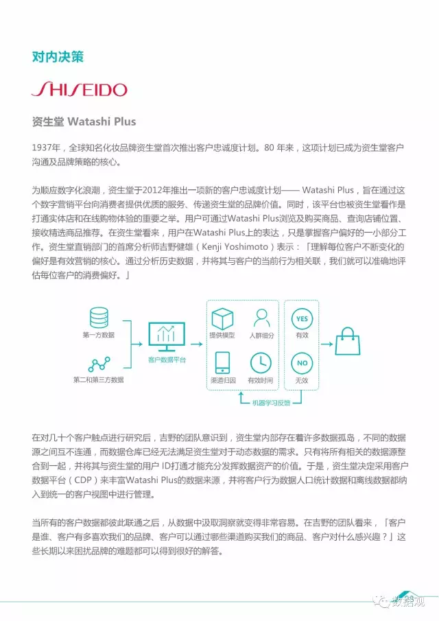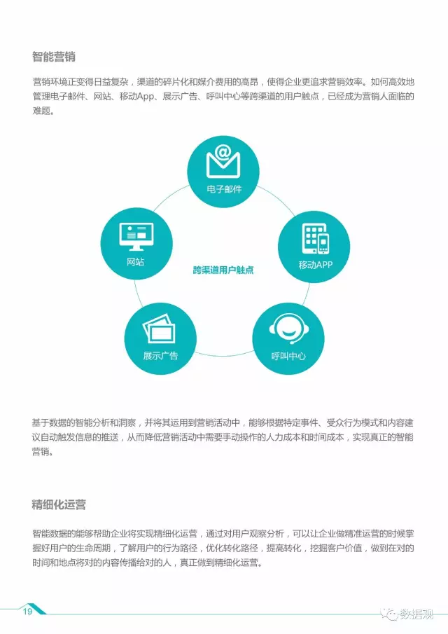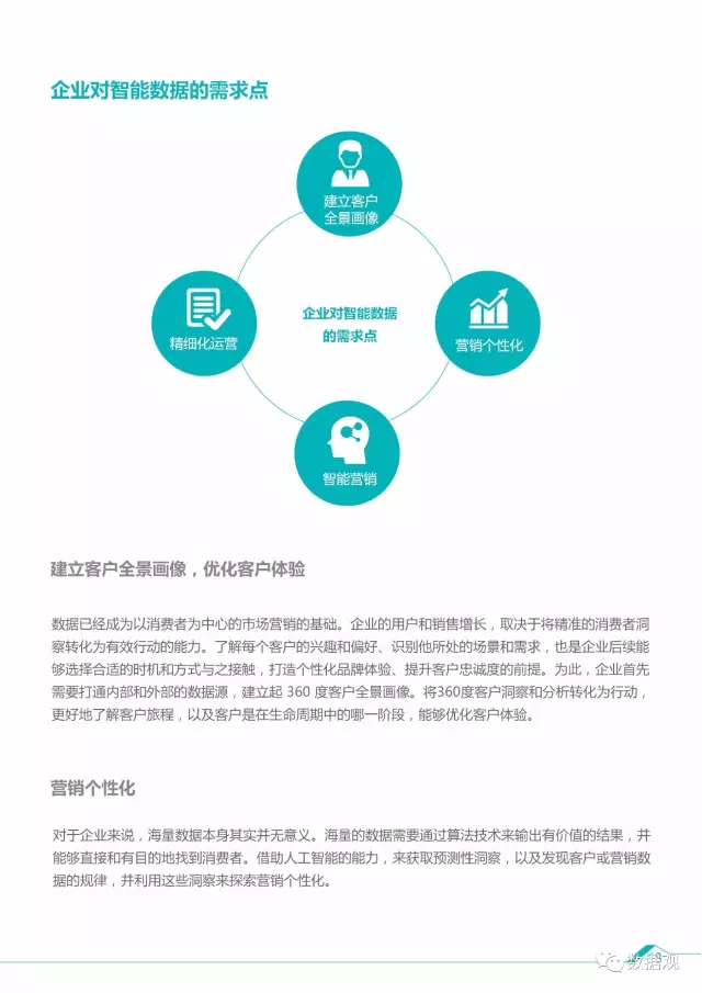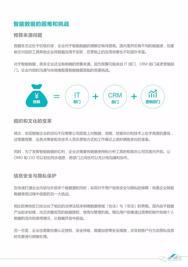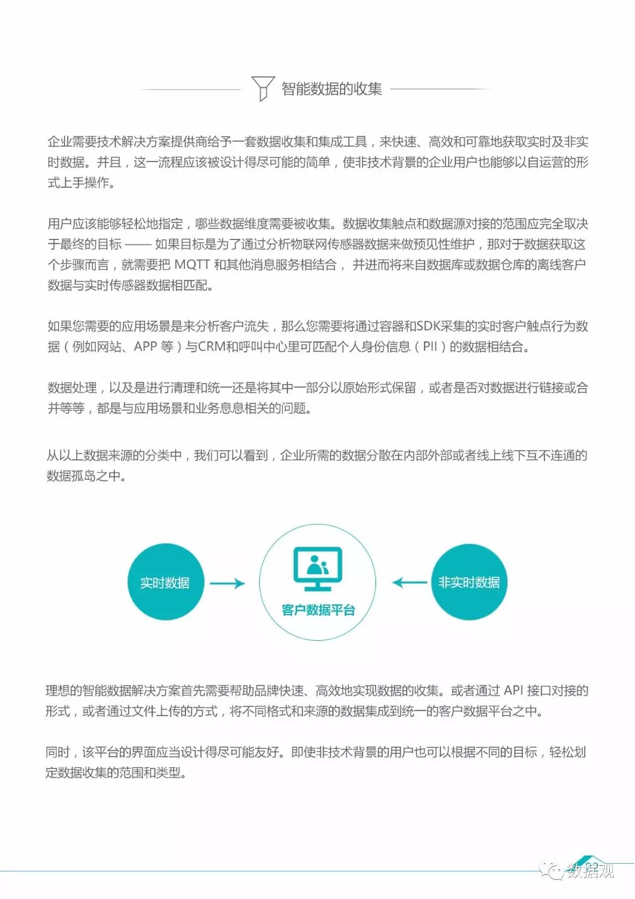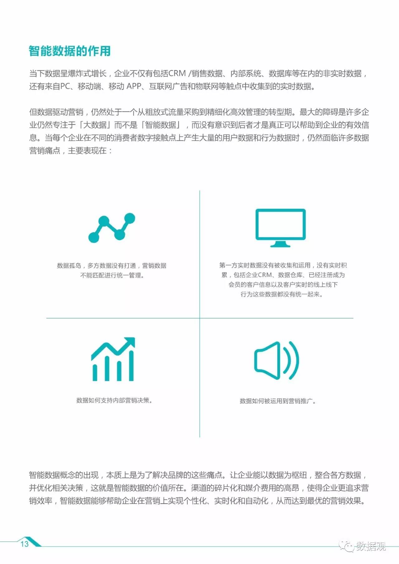 所谓「智能数据」是指那些真正能够应用于解决实际问题的大数据子集。在智能数据的运用上,企业面临的最大难题包括:数据收集、整合与分析以及实现数据应用的闭环。国外像亚马逊、可口可乐、荷兰皇家航空等公司其实已经在对内决策、对外的数据驱动营销以及客户体验的提升和优化上有了较为领先的智能数据实践。