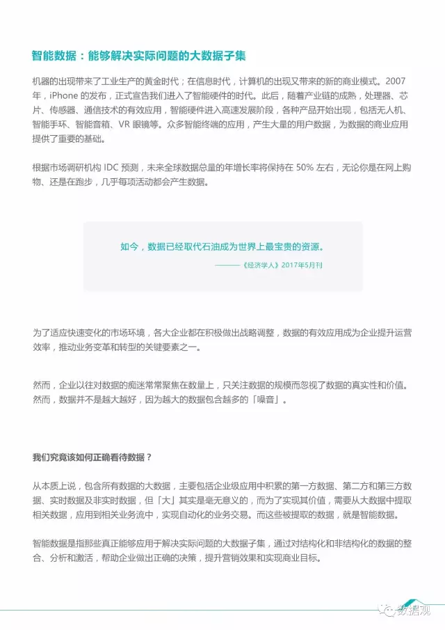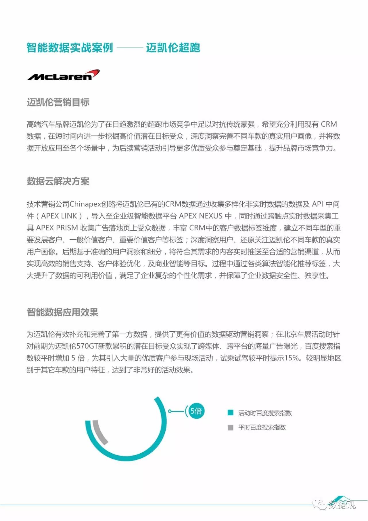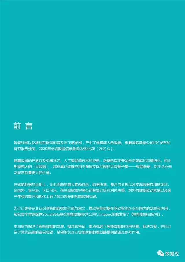 为了让更多企业认识到智能数据的价值与意义,推动智能数据驱动智能企业在国内的发展和应用,知名数字营销媒体 SocialBeta 联合智能数据技术公司 Chinapex 创略发布了《智能数据如何高效驱动营销——智能数据白皮书》(以下简称「白皮书」)。白皮书综述了智能数据的发展、概念和特征,重点梳理了智能数据的应用场景、解决方案,同时也对智能数据的的商业应用——客户数据平台(customer data platform)解决方案的最佳实践案例进行了详细的介绍。