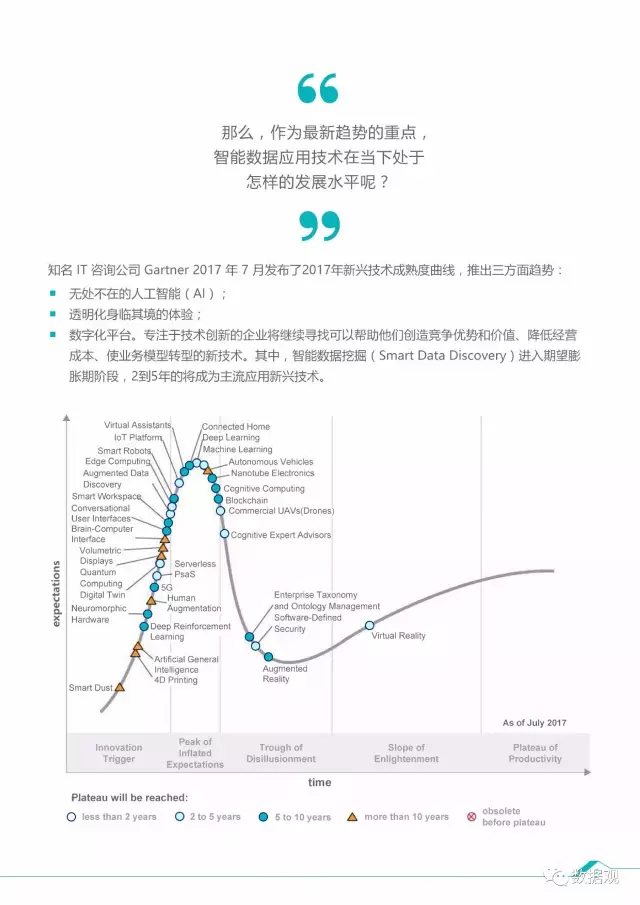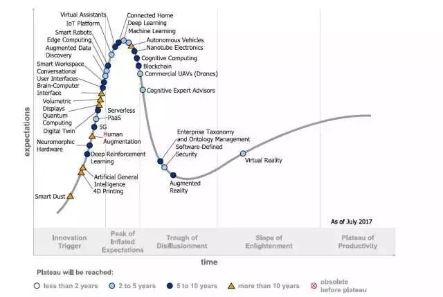 导读:Gartner 7 月发布了2017年新兴技术成熟度曲线,推出三方面趋势:(1)无处不在的人工智能(AI);(2)透明化身临其境的体验;(3)数字化平台。专注于技术创新的企业将继续寻找可以帮助他们创造竞争优势和价值、降低经营成本、使业务模型转型的新技术。其中,智能数据挖掘(Smart Data Discovery)进入期望膨胀期阶段,2到5年的将成为主流应用新兴技术。