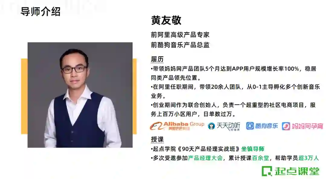 本次授课老师为@黄友敬老师,具有17年互联网产品策划与管理经验,现任职妈妈网产品副总裁,历任阿里高级产品专家、酷狗音乐产品总监等岗位。