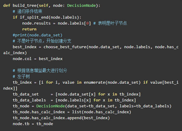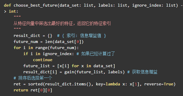 因此计算节点就是调用 best_index = choose_best_future(node.data_set, node.labels, node.has_calc_index) 来获取最佳的信息增益的特征索引。
