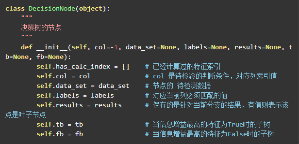 树的节点会有两种状态,叶子节点中 results 属性将保持当前的分类结果。非叶子节点中, col 保存着该节点计算的特征索引,根据这个索引来创建左右子树。
