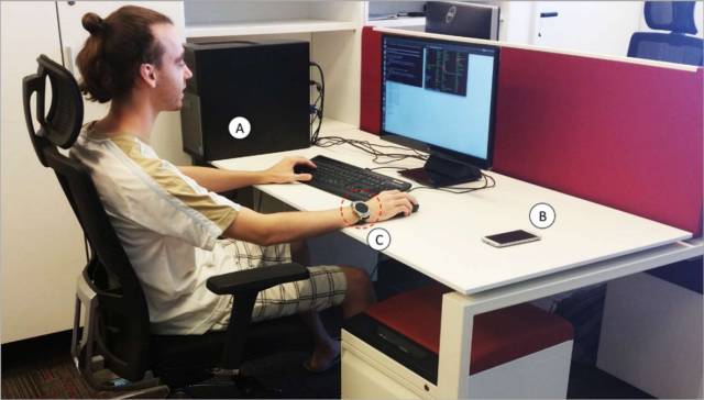 一个典型的应用场景,一台已经拆除了麦克风、扬声器的受攻击电脑(A)正在通过硬盘噪声向旁边的智能手机(B)和智能手表(C)发送敏感信息