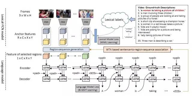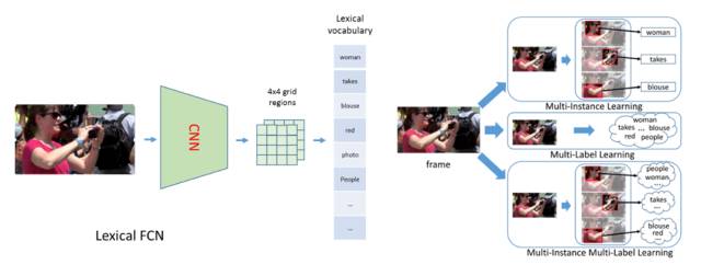 首先,在提取视频特征时,我们提出了Lexical-FCN模型,使用弱监督多实例多标签算法 (Multi-instance Multi-label learning),构建一个从视频的区域序列到单词的弱映射,从而得到一个包含语义信息的视频特征。