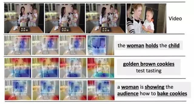 从图3可以看出,虽然训练数据并没有提供每个单词对应视频帧的位置,模型还是可以学习到视频在不同帧中对单词响应最大的区域。