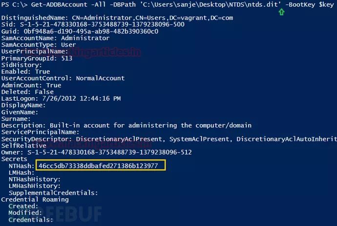 Get-ADDBAccount -All -DBPath 'C:\Users\sanje\Desktop\NTDS\ntds.dit' -Bootkey $key