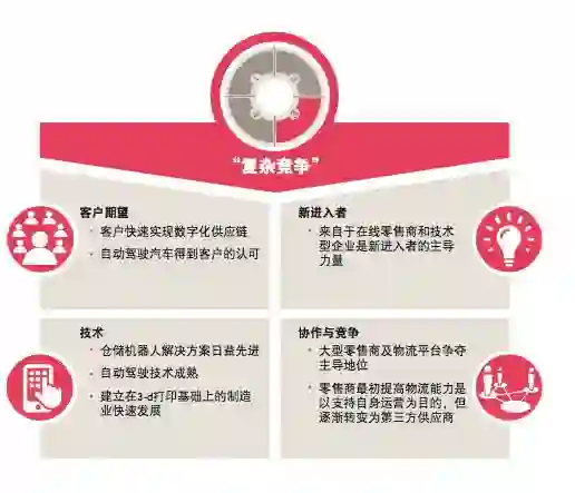 大型零售商参与者扩大其物流服务以满足自身需求,他们通过收购小型物流业参与者以占据更大的市场。而且大型零售商有天然的优势就是对客户行为的深刻理解,可以凭借着对客户行为的理解优化其供应链。曾经作为行业供应商的技术公司也登上了物流舞台,通过提供物流服务,成为行业的竞争者。 未来技术供应商将可以根据自身特长提供物流服务,一些物流服务供应商(LSPs)也会尝试新的商业模式,比如在客户提供的场地建立3D印刷中 心 、发展 3D印刷功能 ,或 提供具备3D蓝图的平台。