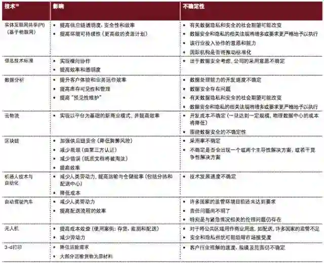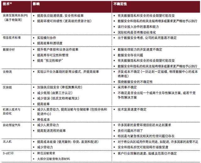 下表是一些新兴技术对物流行业的影响以及存在的不确定性: