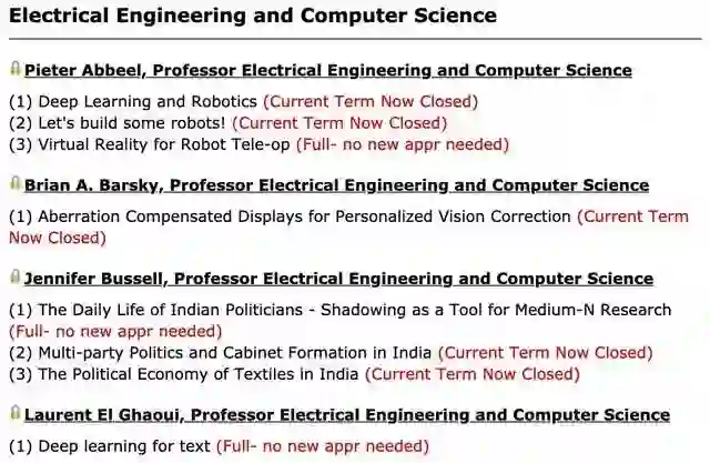 • 阅读EECS研究页面,查看该部门的区域、实验室、中心和项目的完整列表。查看EECS研究项目以查看过去和当前的研究项目。此外,注意你比其他人更喜欢什么课程,这可能会帮助你决定你想在哪里做研究。