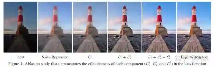 直观地说,平滑度损失鼓励光照在小梯度的像素上是平滑的,而在大梯度的像素上是不连续的。有趣的是,对于曝光不足的照片,图像内容和细节往往很弱。较大的梯度更可能是由不一致的光照造成的。如图4中的第4幅图像所示,通过进一步加入平滑度损失,我们恢复了良好的图像对比度,与仅重建损失的结果相比,细节更加清晰。