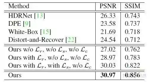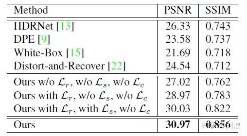 使用了两个常用的度量标准(即,PSNR和SSIM)来定量评估我们的网络性能,根据预测结果和相应的专家润色图像之间的颜色和结构相似性。虽然这不是绝对的指示性,但总的来说,高的PSNR和SSIM值对应着相当好的结果。