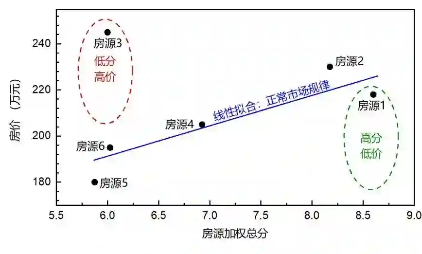 拟合线:拟合线代表房源得分与房屋总价相符,可认为符合市场规律;
