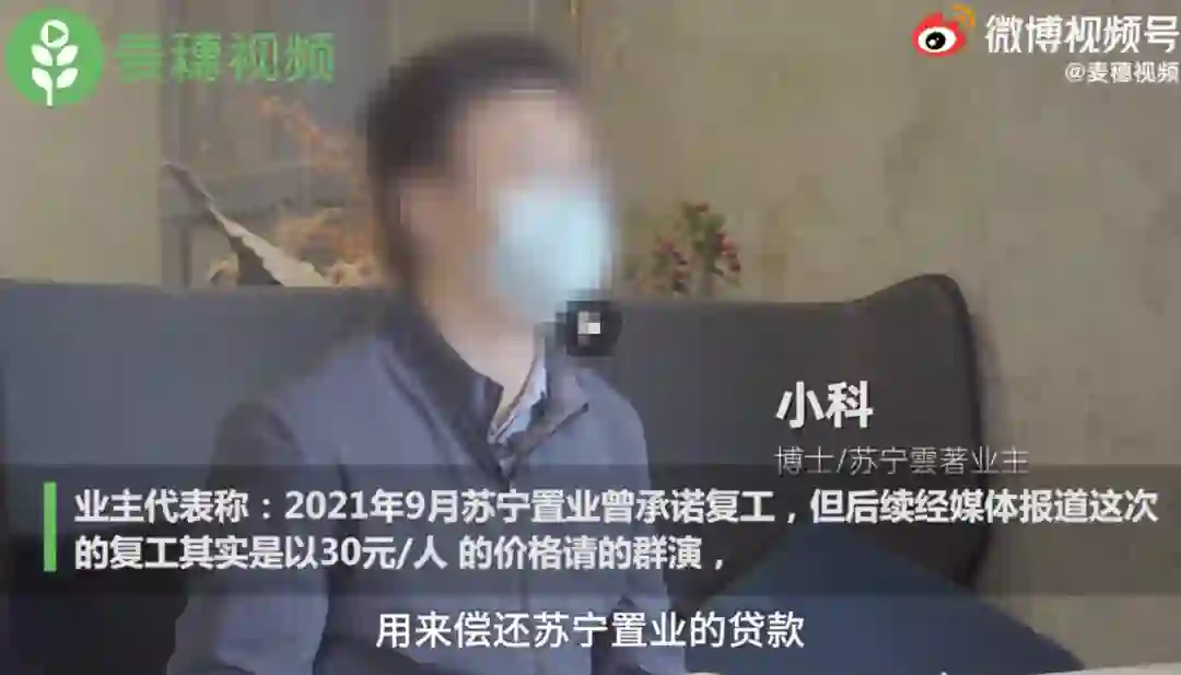 于是小区业主们找到苏宁置业,苏宁置业承诺承诺2021年9月复工,不过却被业主们发现工地现场的工人是“群演”假扮的。