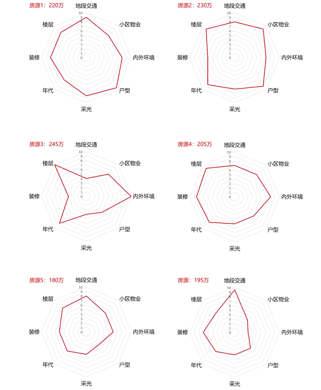 每套房子的评价参数有8个,分别是:地段交通、小区物业、内外环境、户型、采光、年代、装修、楼层。通过给不同指标打分,可以得出每套房子的雷达图(如图1)。
