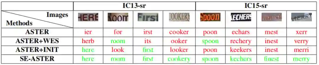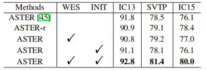 TABLE 1中的结果是在ASTER[1]模型的基础上整合SEED部件的消融实验,INIT是有初始化Decoder的RNN,而WES是有预训练的FastText[3]模型的监督。二者单独使用对几个数据集提升不大,甚至可能会更差。二者的组合使用能够有较大的提升。