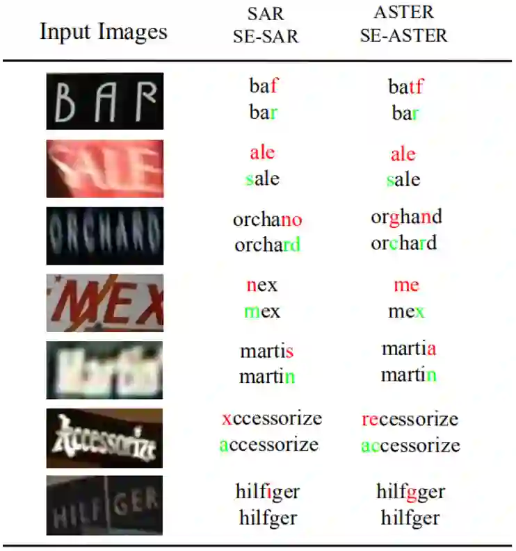 SE-ASTER和SE-SAR分别是在ASTER[1]和SAR[2]与SEED的整合。TABLE 2展示了SE-ASTER与其他SOTA识别器的对比,可以看到SE-ASTER的性能具有一定的竞争力。TABLE 3和 Fig.4是一些识别的可视化,可以看到,SE-ASTER和SE-SAR是能够对低质量文本起到一定作用的。