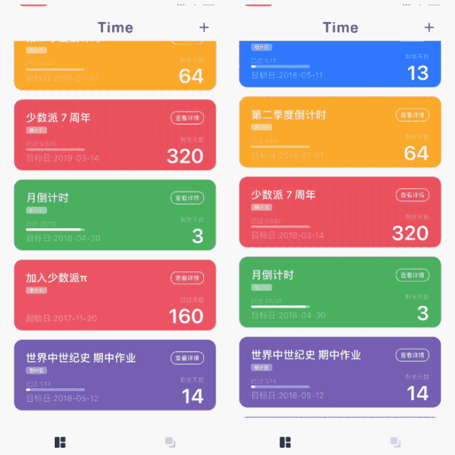 在 Time 中,所有日期被分为「倒计日」和「累计日」,前者用于记录未来某日到今天的天数,后者用于记录过去某日到今天已经多少天了。通过这两个分类,你可以记录每一个对你来说有特殊意义的日子。同时,在每个日子中,你还可以为它们添加备注,记录更多东西。