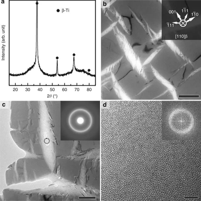 前者导致b相转变为a¢/a²马氏体,后者导致晶面{222}b部分移位形成w相。而对于特定成分的b钛合金,马氏体相变过程中的局域晶格切变和畸变使得结构无序的非晶相相对于晶态a¢/a²/w相更容易形成,导致马氏体非晶化的出现(如图)。这种非晶相可被称为“非晶马氏体”。这一发现丰富了固态非晶化机制和马氏体相变理论。