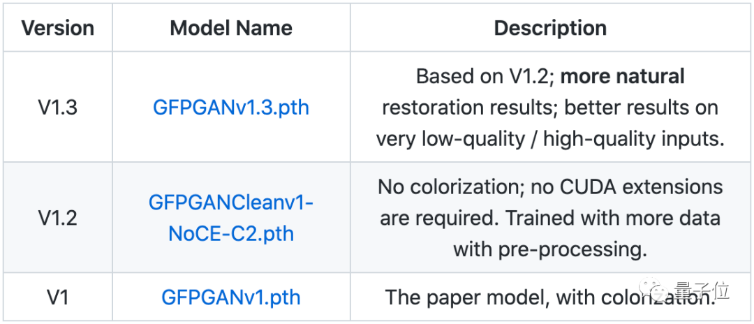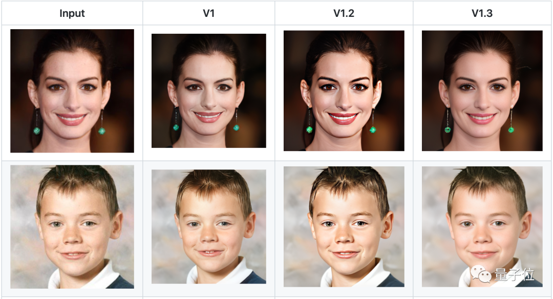 其中,V1.3是最近更新的一版,修复效果更加自然。同时还能在低质量输入的情况下,输出高质量结果。