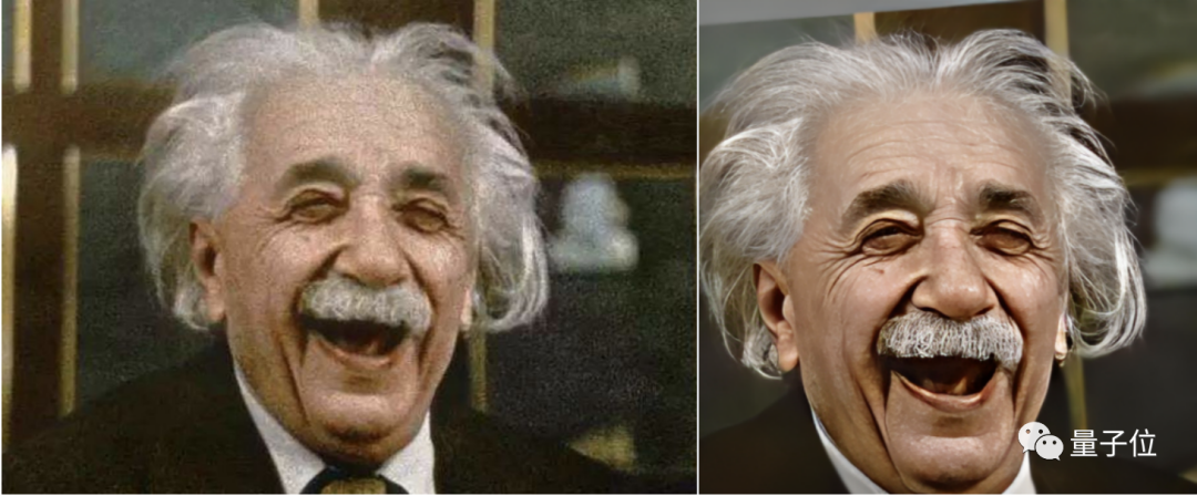 修复的爱因斯坦,笑起来时脸上的褶皱更加明显,头发丝、胡茬也都被还原了出来。