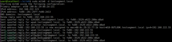 以下截图显示了mitm6的攻击过程。该工具自动检测攻击者计算机的IP配置,并以包含攻击者IP作为DNS服务器的DHCPv6应答回复网络中客户端发送的DHCPv6请求。它将周期性的发送通告路由器(RA)消息来提醒客户端存在IPv6网络,并且客户端应该通过DHCPv6请求IPv6地址。这在某些情况下会加快攻击速度,但这并不是必须要做的工作,我们可以在具有SLAAC攻击防护的网络上执行此攻击。