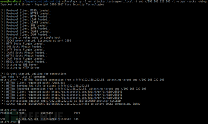 在前面的几节内容我对该类攻击做了一个大致的描述和解释。执行此攻击本身非常简单。首先我们启动mitm6,它将开始中继DHCPv6请求,然后开始在内部网络中向DNS查询请求名称。在攻击的第二部分,我们将使用到中继工具ntlmrelayx。这个工具是Core Security impacket Python库的一部分,是smbrelayx工具的一个改进版支持多种协议。Core Security和Fox-IT最近共同改进了ntlmrelayx,增加了几项新功能(其中包括)使其能够通过IPv6进行中继,提供WPAD文件,自动检测代理请求并提示受害者进行正确的身份验证。如果你想进一步的了解这些新功能,请点击relay-experimental分支查看。