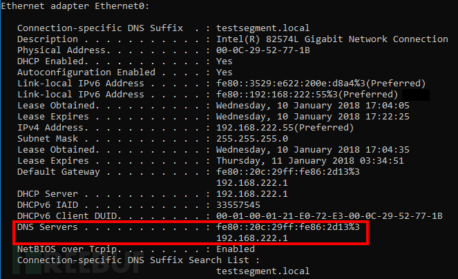 在受害者机器上,我们看到我们的服务器被配置为了DNS服务器。由于Windows对IP协议的偏好,IPv6 DNS服务器将优于IPv4 DNS服务器。IPv6 DNS服务器将会 被用于查询A(IPv4)和AAAA(IPv6)记录。