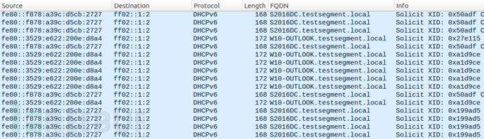首先让mitm6开始在攻击者机器的主接口上侦听,并通过DHCPv6向 Windows客户端请求IPv6配置。默认情况下,自Windows Vista之后,每台Windows计算机都会定期向该配置发起请求。我们可以通过Wireshark抓包来进行查看:
