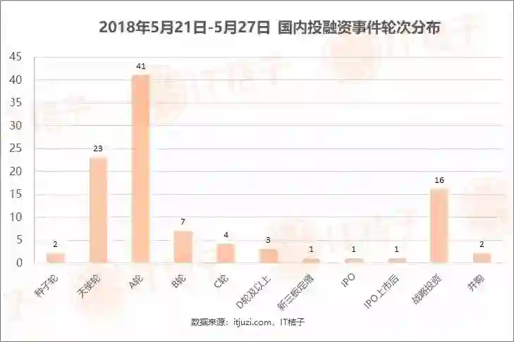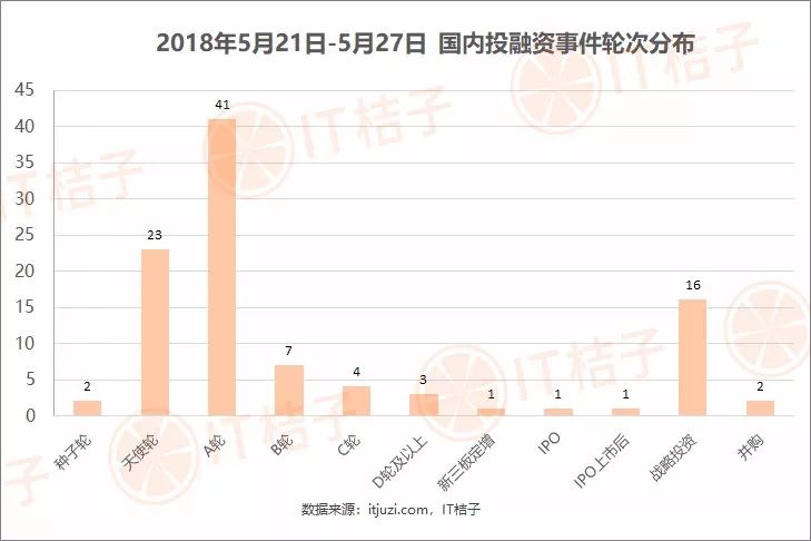 上周发生在早期的投融资事件最多,其中发生在 A 轮的投资事件有 41 起,天使轮有 23 起,早期事件占比 63% 左右。同时,上周共发生 16 起战略投资。