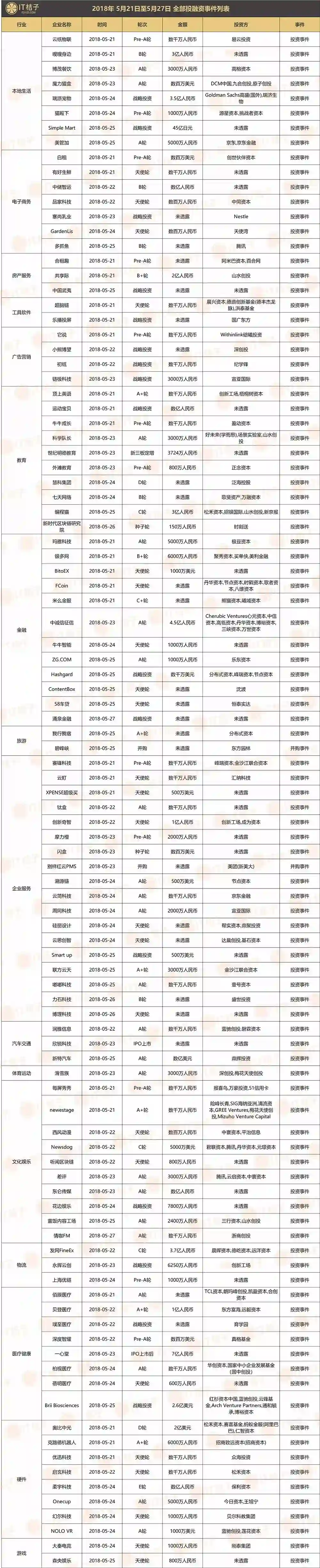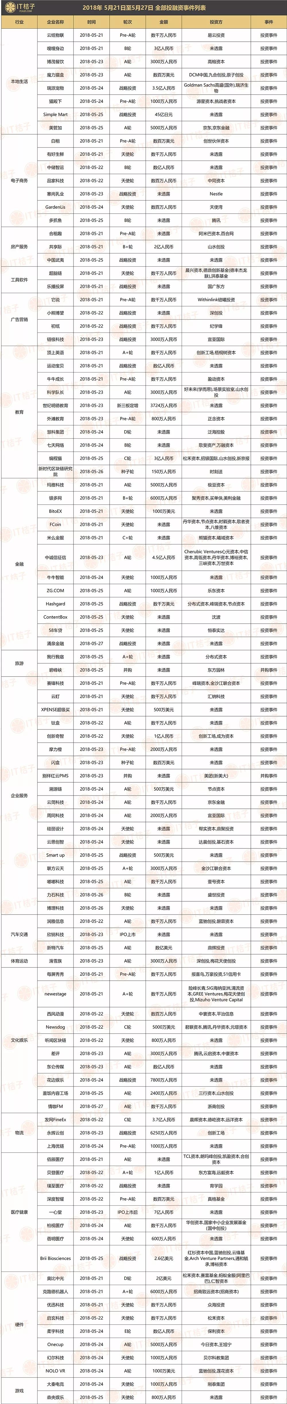 教育领域,5 月 21 日,留学英语培训机构,顶上英语宣布完成数千万元人民币 A+ 轮融资,由梧桐树资本领投,创新工场继续跟投。5 月 23 日,科学教育产品和服务商科学队长 A 轮融资 3000 万元,本轮融资由好未来,场景实验室,山水创投投资。5 月 25 日,儿童编程教育平台,编程猫宣布获得 3 亿人民币新一轮融资,招银国际领投。
