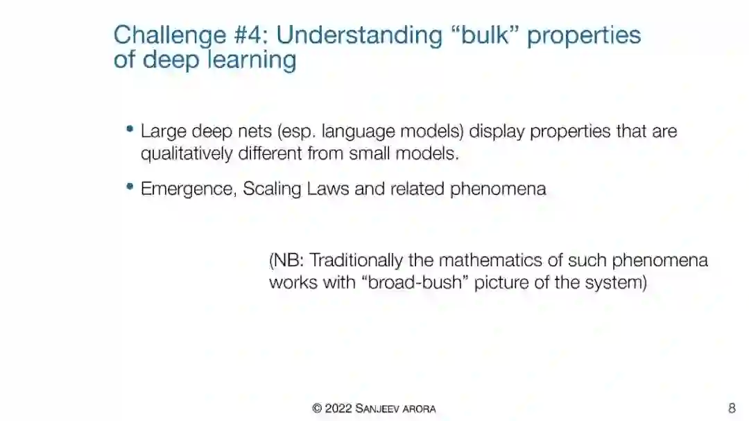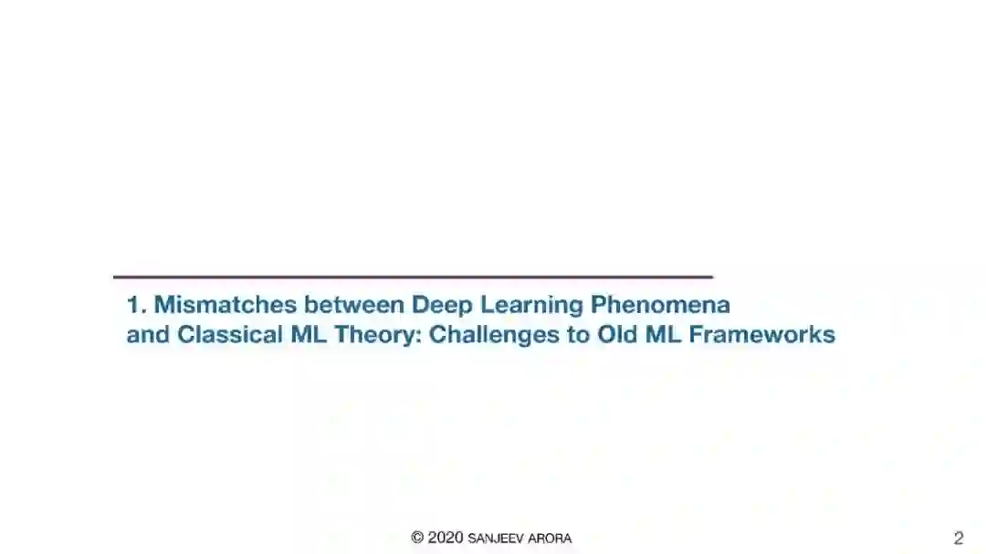 最近,深度学习在许多AI/ML任务中被证明非常成功,但对该技术的理论理解一直滞后。这次报告将调研正在进行的努力,以理解这种方法的成功,包括优化方面和巨大的网络在微小数据集上不过度拟合的神奇能力。
