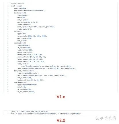 V2.0改进:我们设计了新的 config 系统,支持了多重继承机制。将常用的数据集配置、基础模型以及训练策略放到了 _base_ 文件夹中,每个新的 config 只需要继承一个或者多个已有的 config,然后对其中需要修改的字段进行重载即可。下图是 Mask R-CNN R-101 的配置文件在 1.0 和 2.0 版本的对比。V2.0 版本 只需要 2 行,而且所有的改动一目了然,如下图所示。
