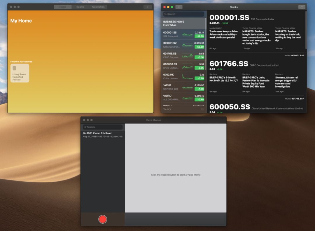 在 WWDC 2018 上,苹果宣布了一种将 iOS 上 UIKit 映射到 macOS 上的 AppKit 的方式,通过这种方式将 iOS 应用移植到了 Mac 上并拥有更加本地化的操作体验。在 macOS 10.14 Mojave 中,苹果率先移植了 3 个 iOS 系统自带应用到 macOS 中,分别为股市、家庭和语音备忘录。