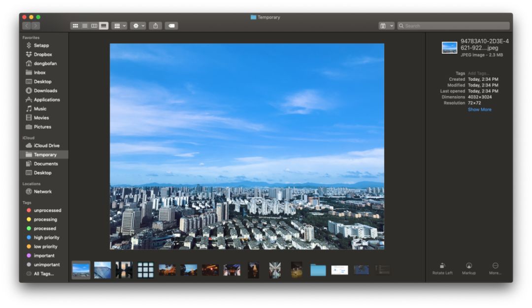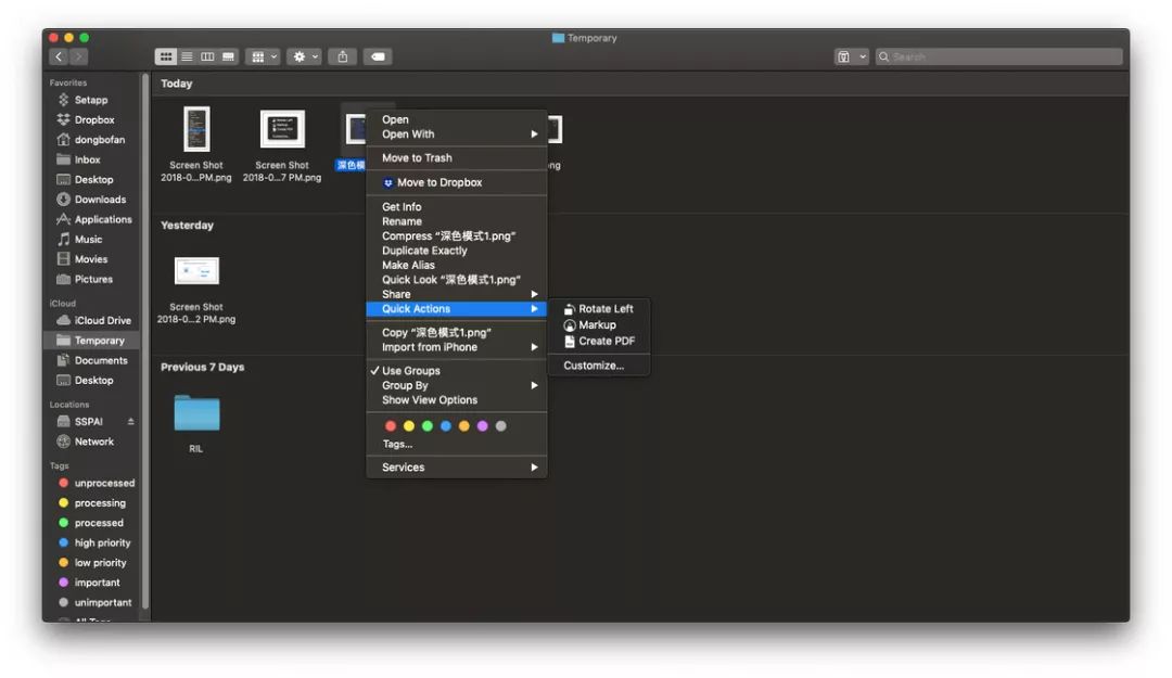 最后,访达里的快速预览功能也得到了加强。在之前的 macOS 版本中,我们可以通过选中文件后敲击空格键来快速预览文件内容,包括图片、PDF、Text 等格式,但是无法进行更多的操作。而在 Mojave 中,我们可以在快速预览状态下直接对预览内容进行一些简单的操作,比如说你可以在预览图片时进行标注或者旋转,而不用再像之前那样双击打开图片后再进行这些操作了。值得注意的是,你在快速预览时进行的操作会被实时保存到原文件中。