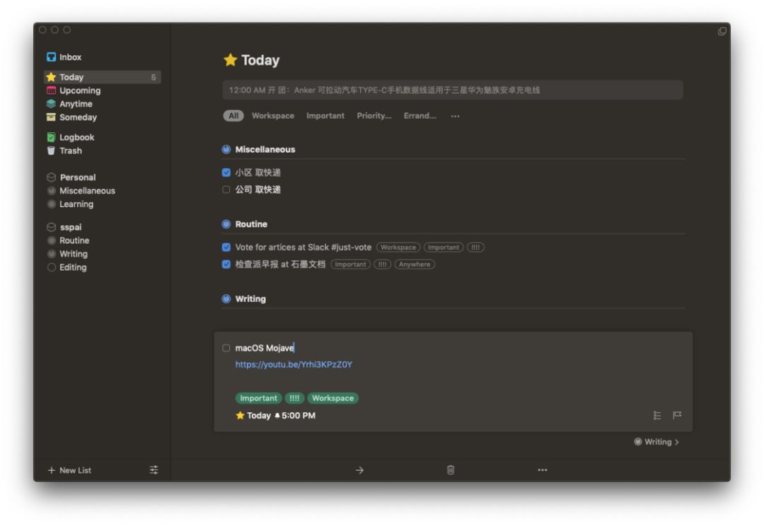 更令人欣喜的是,深色模式不仅涵盖了所有的系统自带应用,而且第三方应用也相继跟进,在今天纷纷更新并加入了深色模式,包括 Things、1Password、Ulysses 以及 Setapp 里的大多数应用。