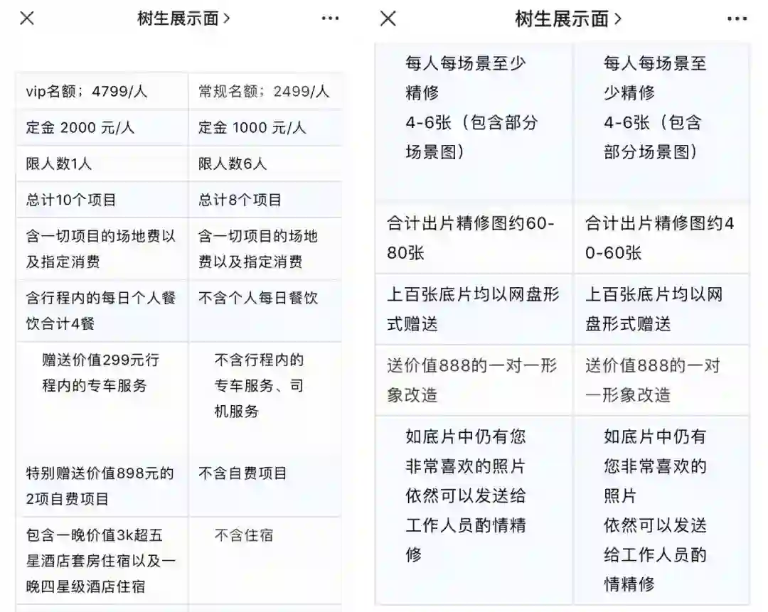 记者联系到了一家名为“树生展示面”的拍摄机构,工作人员称,省钱一点的做法就是“等我们开计划的时候你选个城市来就行了”,每次接待人数在6人以内,成本更高的是定制化服务,客户选定地点,摄像团队跟拍。