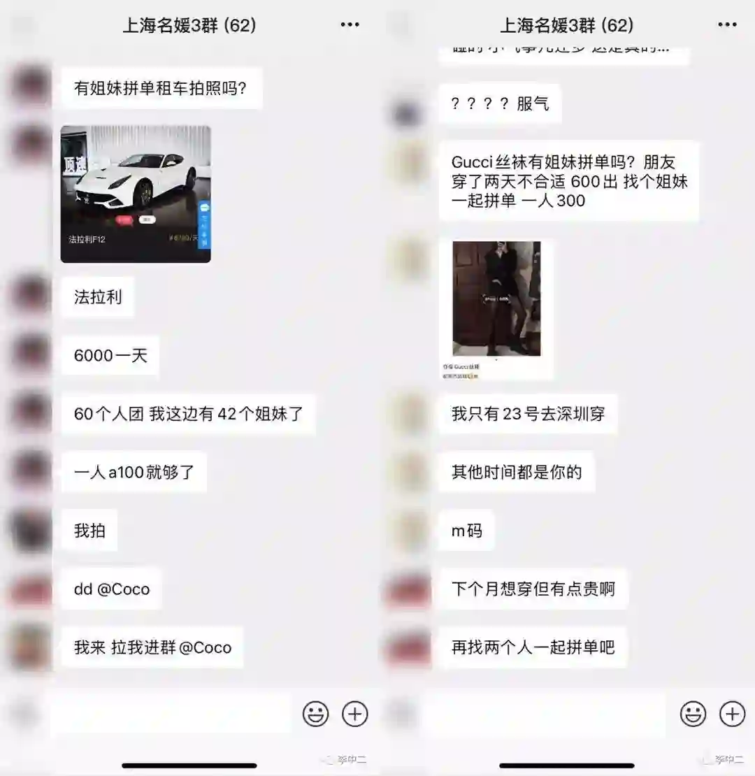 按照文章的描述,这些所谓的“名媛”,交500元入群费,怀揣着结交金融巨子的梦想,为了打造显贵人设,40个人拼单一间宝格丽酒店,6个人拼单丽思卡尔顿的双人下午茶,甚至还能接受群里姐妹穿了两天的二手Gucci丝袜,堪称共享经济的另一种实践。