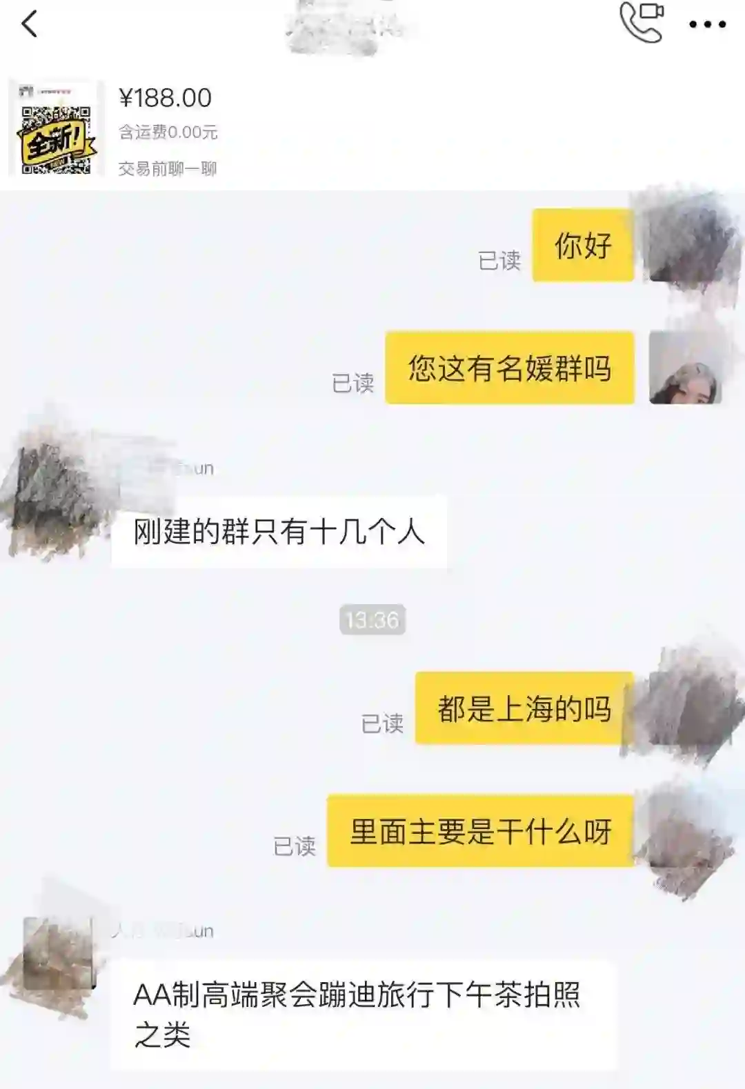 “上海名媛”的话题一火,闲鱼上就有人火速挂出188元上海名媛群,降低了入门费,当记者询问该群是干什么的时候,卖家表示:“刚建群只有十几人,主要是AA制高端聚会、蹦迪、旅行、下午茶拍照之类。”