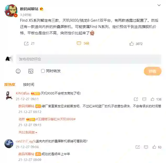 @数码闲聊站 今日透露 OPPO Find X5 系列暂定有三款机型,将搭载天玑 9000 / 骁龙 8 Gen 1 双平台。此外,OPPO 继 Find N 折叠屏手机之外,还将推出一款竖向向内折叠的新机,可能不包含在 Find X5 系列中,隶属 Find N 系列,这款折叠屏新机将于 2022 年上半年发布。此外,OPPO Find X5 系列手机将搭载 OPPO 首款自研影像芯片马里亚纳 MariSilicon X。