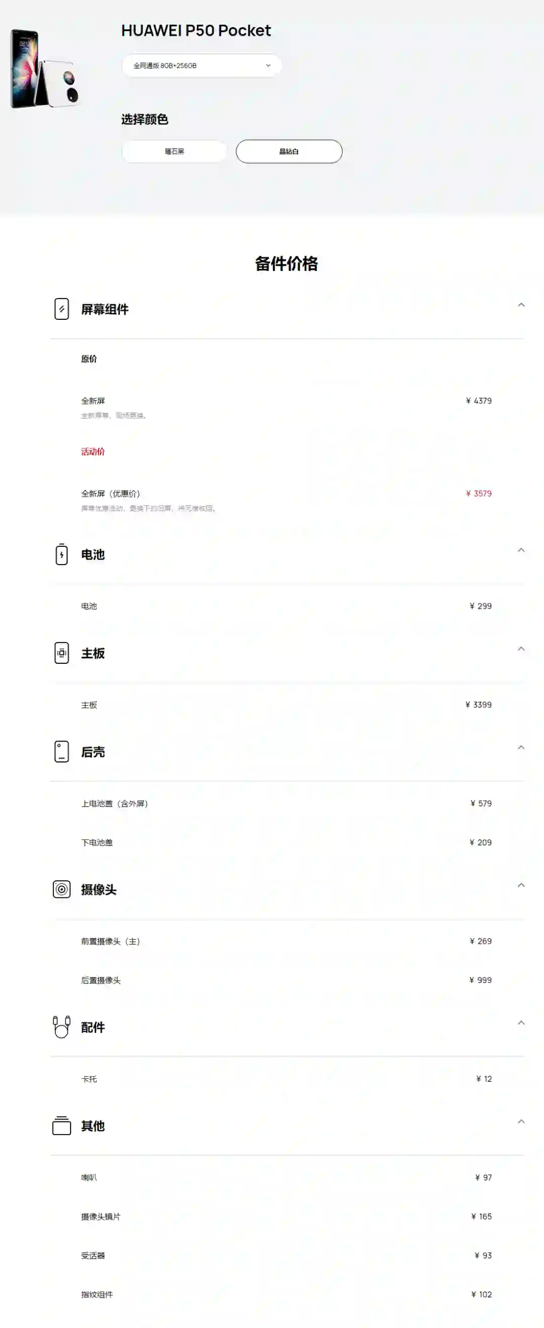 华为今日在官网公布了折叠屏新机 P50 Pocket 的售后服务详情,一块全新屏幕达到了 4379 元,这个价格甚至超过了部分国产高端旗舰。其他可维修部件还包括主板、上电池盖(含外屏)以及后摄镜头等,价格分别为 3399 元、579 元、999 元,整体来看,最便宜的备件价格为 14 元的卡托。值得一提的是,针对华为 P50 Pocket,华为推出了碎屏服务宝和延长服务宝服务,碎屏服务宝覆盖内屏和外屏保障,使用该权益,碎屏后可享低价服务费换屏。
