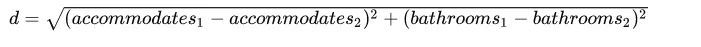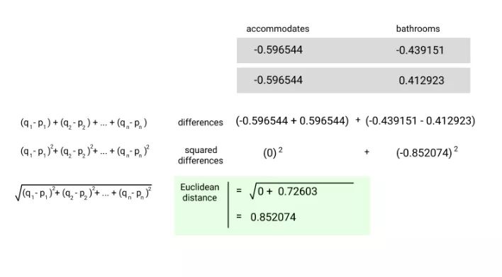 为了找到两个居住空间之间的距离,我们需要计算两个accommodates值之间的差值平方,两个bathrooms值之间的差值平方,将它们相加,然后对结果的和取平方根。