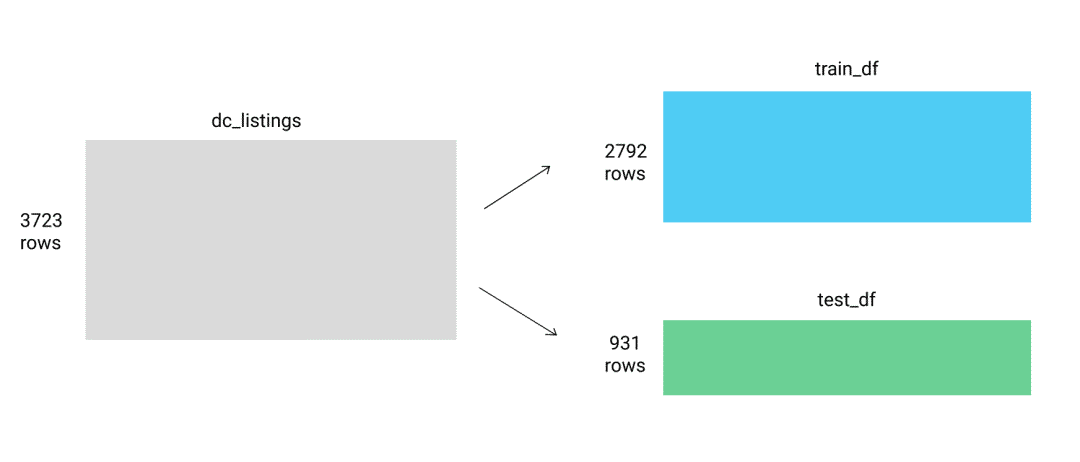 我们将采用这种方法,将我们的3723行数据集分成两部分: train_df 和 test_df,以75%-25%的比例进行分割。