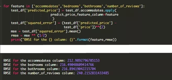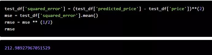 我们的RMSE大约是213美元。关于RMSE的一个方便的事情是,由于我们进行了平方然后取平方根,因此,RMSE的单位和我们预测的值是一样的,这使得我们很容易理解误差的标度。