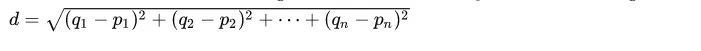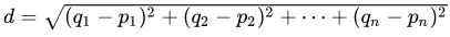 Here’s the general formula for Euclidean distance: d=(q1−p1)2+(q2−p2)2+⋯+(qn−pn)2 where q1 to qn represent the feature values for one observation and p1 to pn represent the feature values for the other observation.